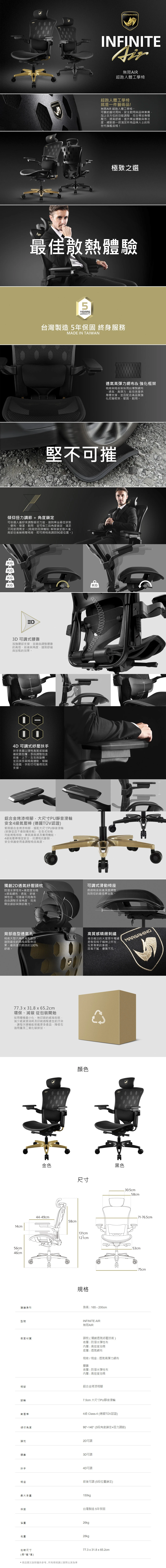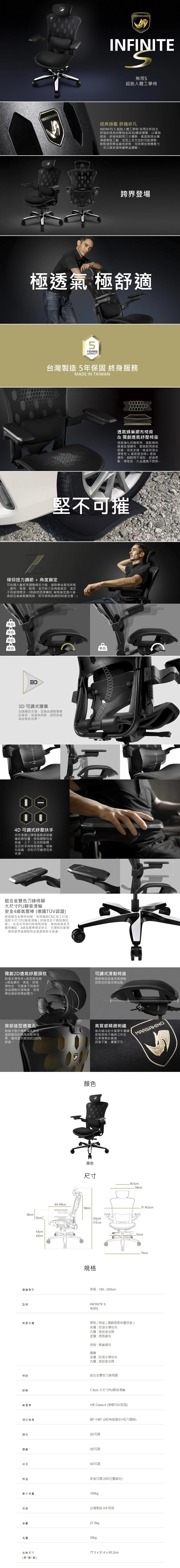 ● 最大承重150公斤 ● 5年保固:頭枕、椅背、椅座、椅腳 ● 1年保固:扶手總成、底盤機構、氣壓棒、腳輪 ● 商品須自行簡易安裝,組裝前請詳閱說明書