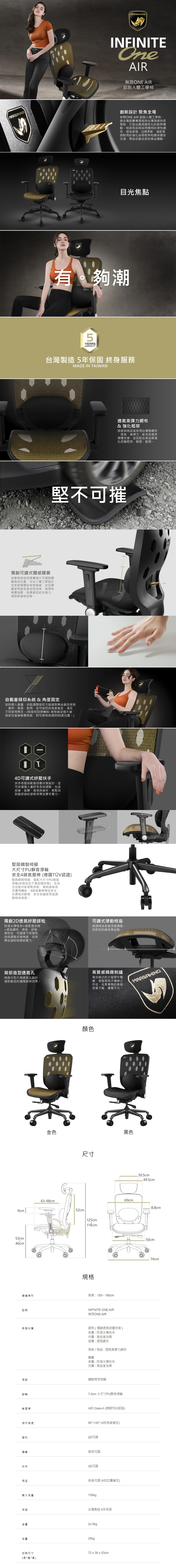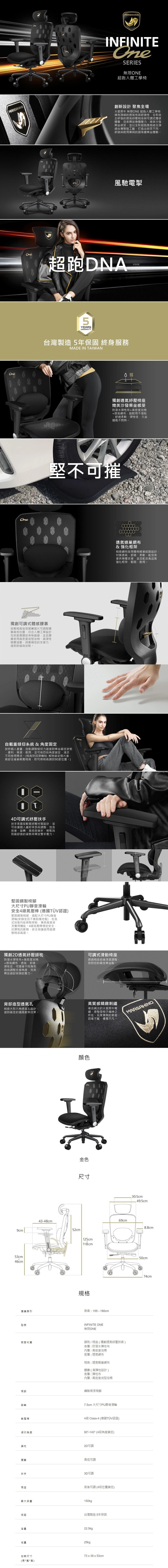 ● 最大承重150公斤 ● 5年保固:頭枕、椅背、椅座和椅腳