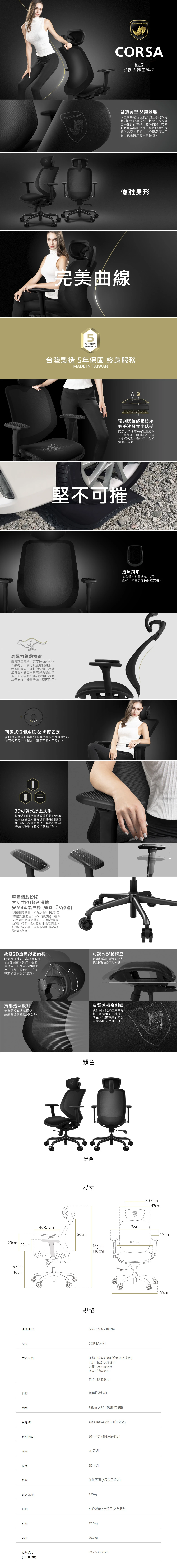 ● 最大承重150公斤 ● 5年保固:頭枕、椅背、椅座和椅腳
